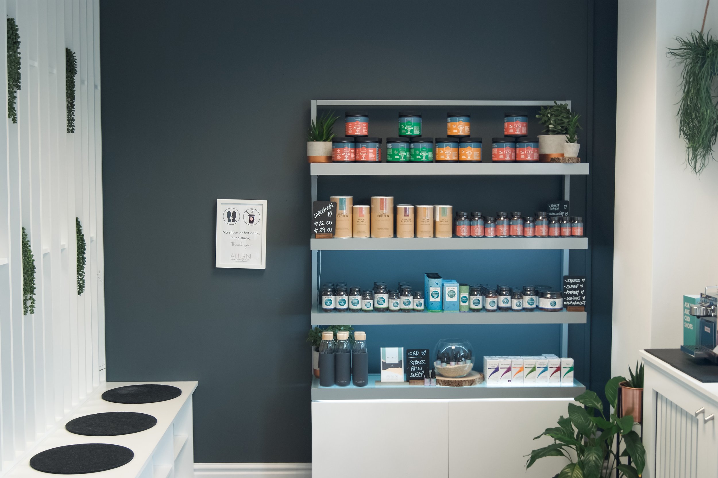 Interior of a store with shelves displaying jars and boxes of products, a small plant, and a sign. The walls are dark gray. A white bench with black pads is to the left.