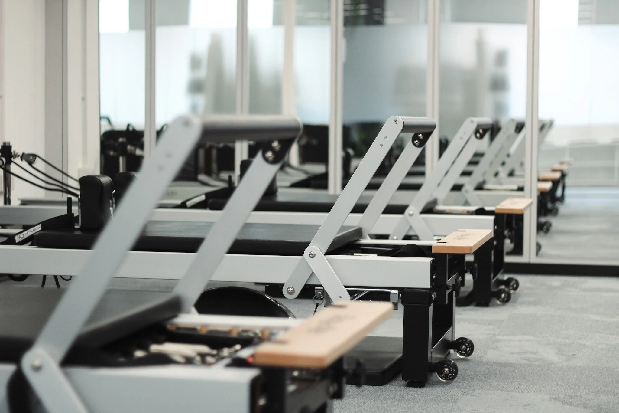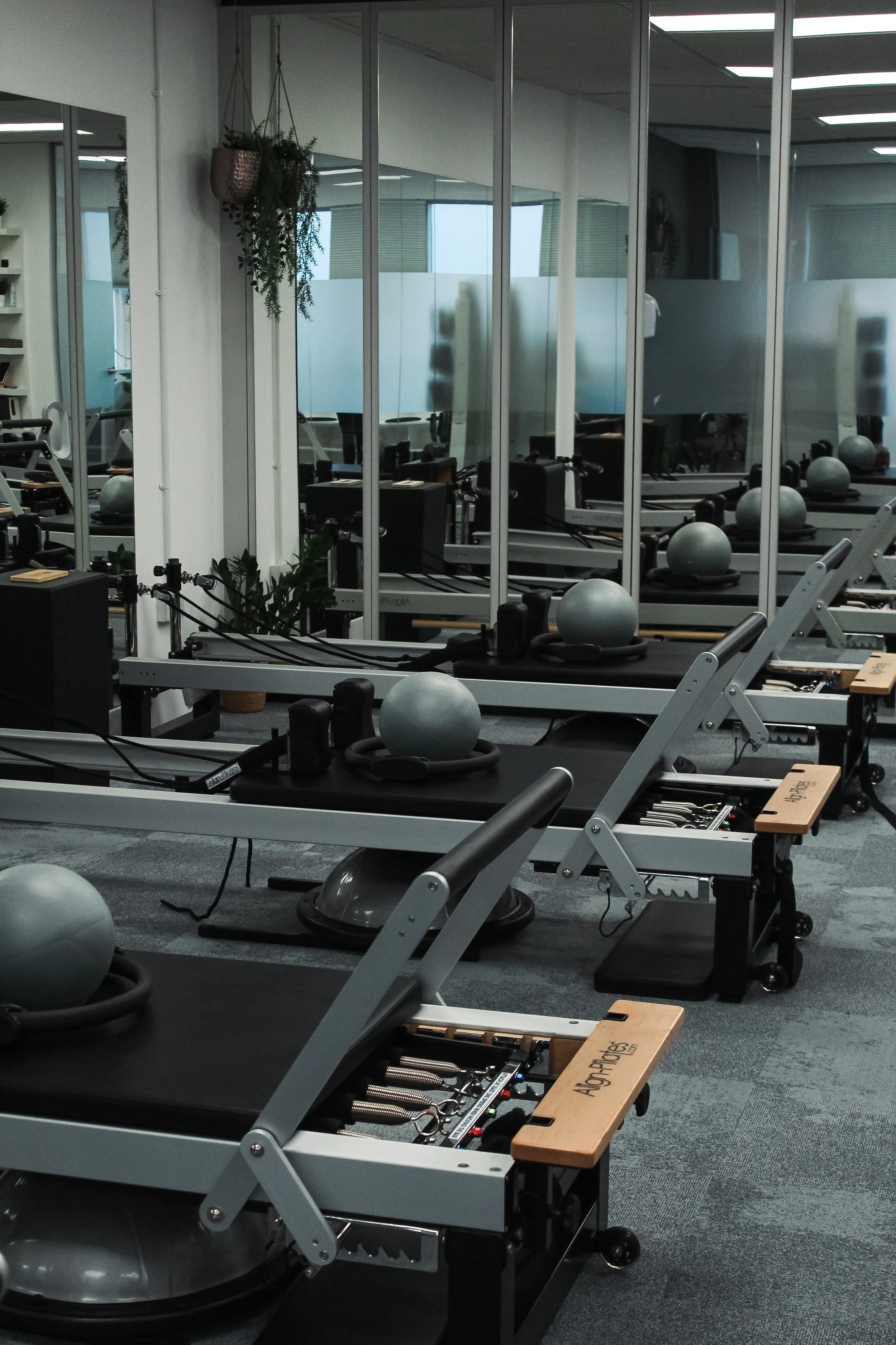 Row of Pilates reformer machines in a fitness studio with mirrors.