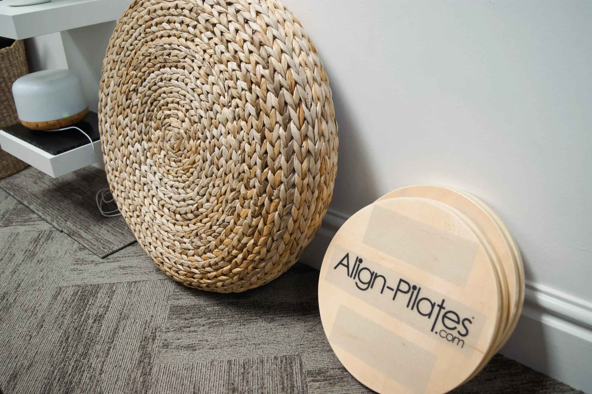 A woven mat and Align-Pilates wooden exercise boards leaning against a wall, with a small shelf and an electronic device nearby.