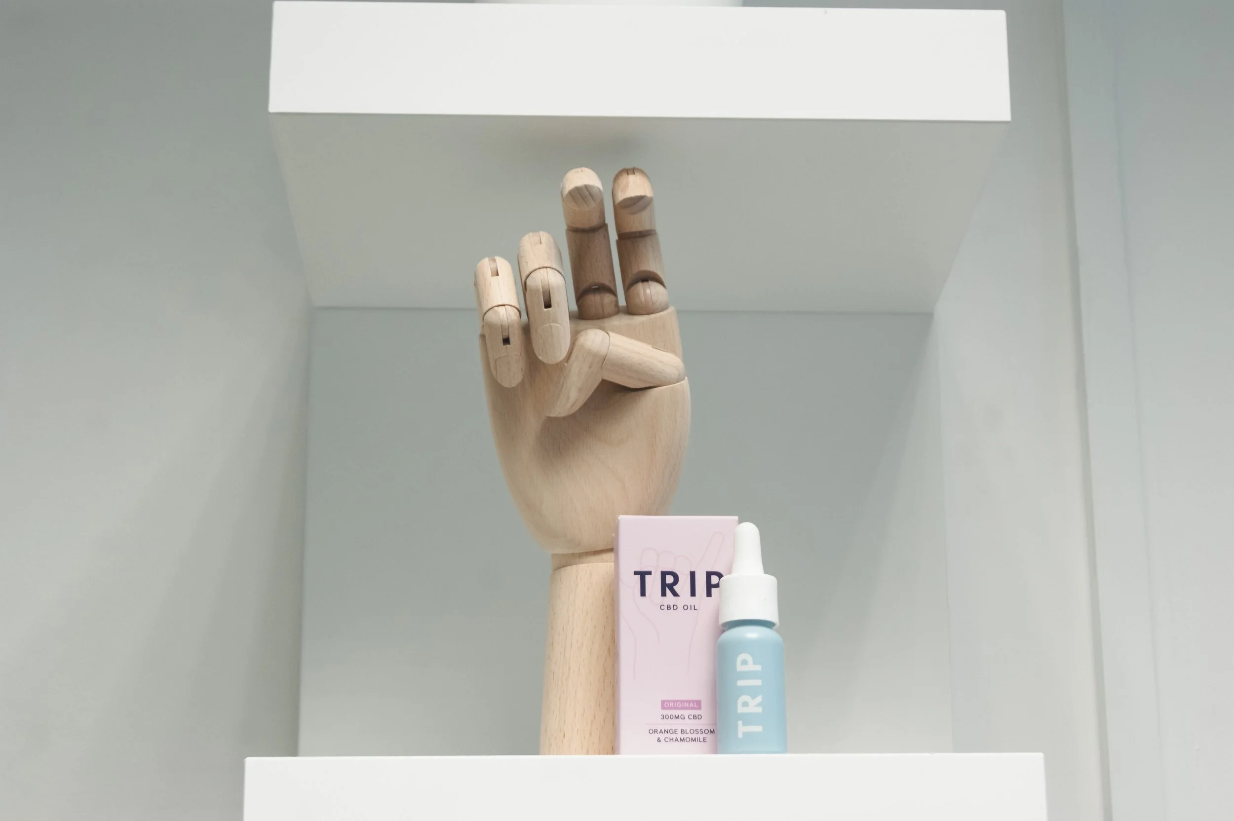 Wooden hand mannequin posing with CBD oil bottle and packaging labeled "TRIP" on a shelf.