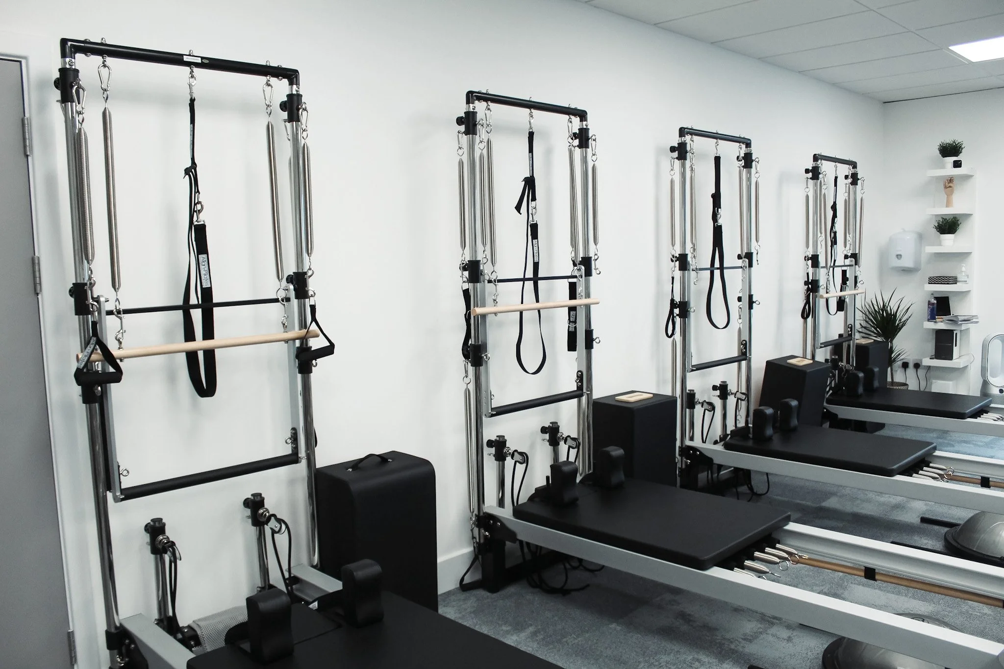 Interior of a Pilates studio with multiple reformer machines and exercise equipment.