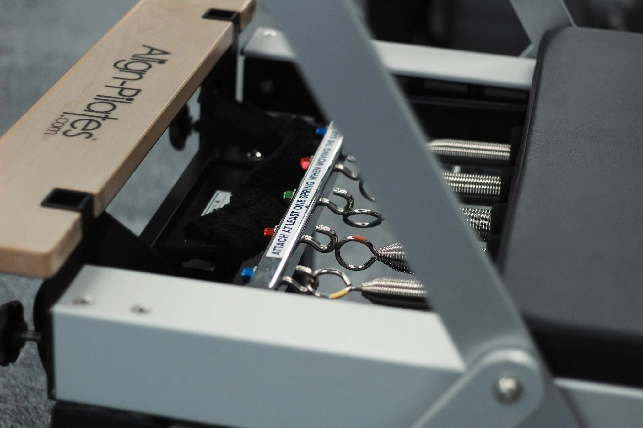Close-up of a Pilates reformer, showing springs and adjustment settings.