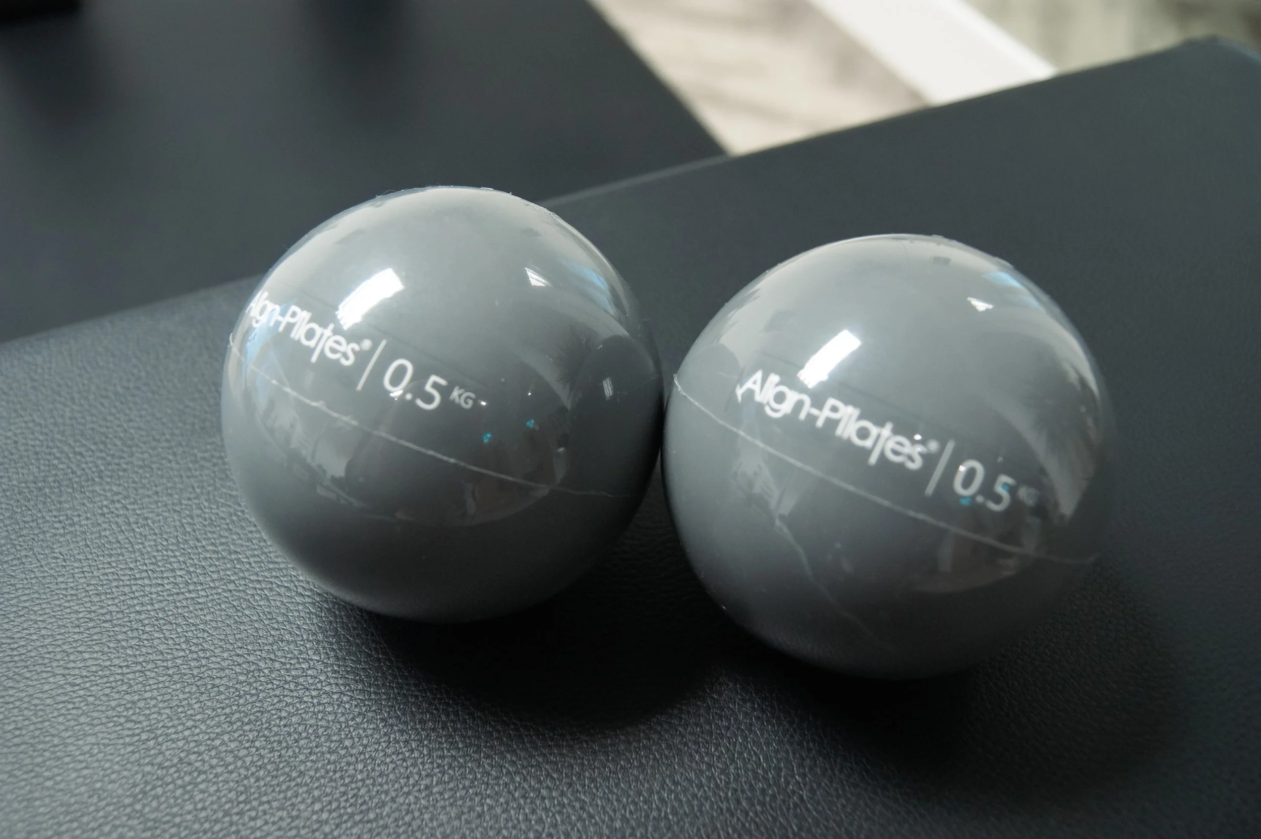 Two gray Align-Pilates soft weight balls on a black surface, each marked 0.5 kg.